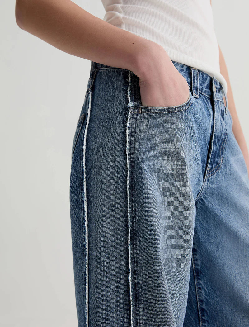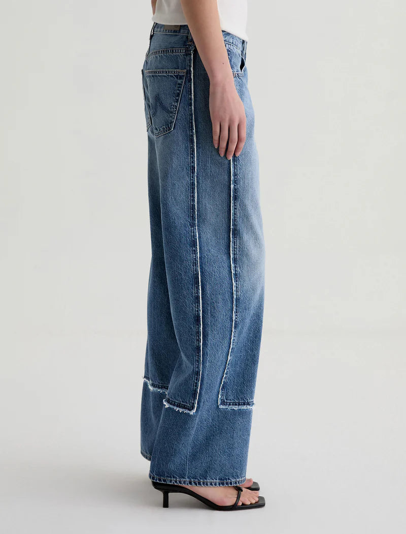 The Adria Paneled Fit features a paneled design with a low-rise, wide-leg fit and a 32” inseam. Made from non-stretch Japanese 11.75 oz. Legion Denim in a medium wash, it delivers a structured silhouette with a vintage-inspired feel.