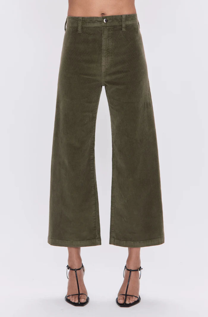 High rise waist, with a wide leg silhouette and a cropped, ankle length hemline. Crafted from our signature comfort stretch denim, with a double stitched waistline and scissor cut hems. Frost blue is a cool toned, icy blue colored denim with a snow blasted fading treatment throughout.