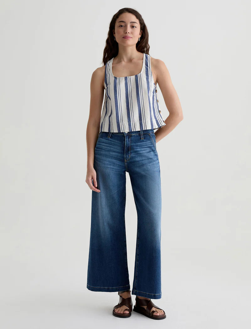 The Stella Ankle is a mid-rise palazzo jean with a 28.5” inseam, crafted from Japanese comfort stretch denim in a dark indigo shade. This style features a subtle wide flare and soft whiskering at the waist.