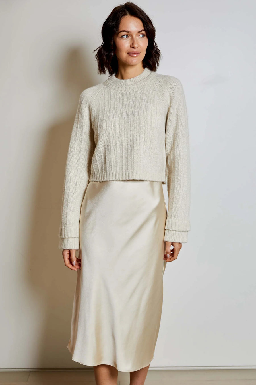 Sweater: 9% Cashmere, 49% Nylon, 27% Wool, 15% Acrylic | Slip dress: 100% Polyester