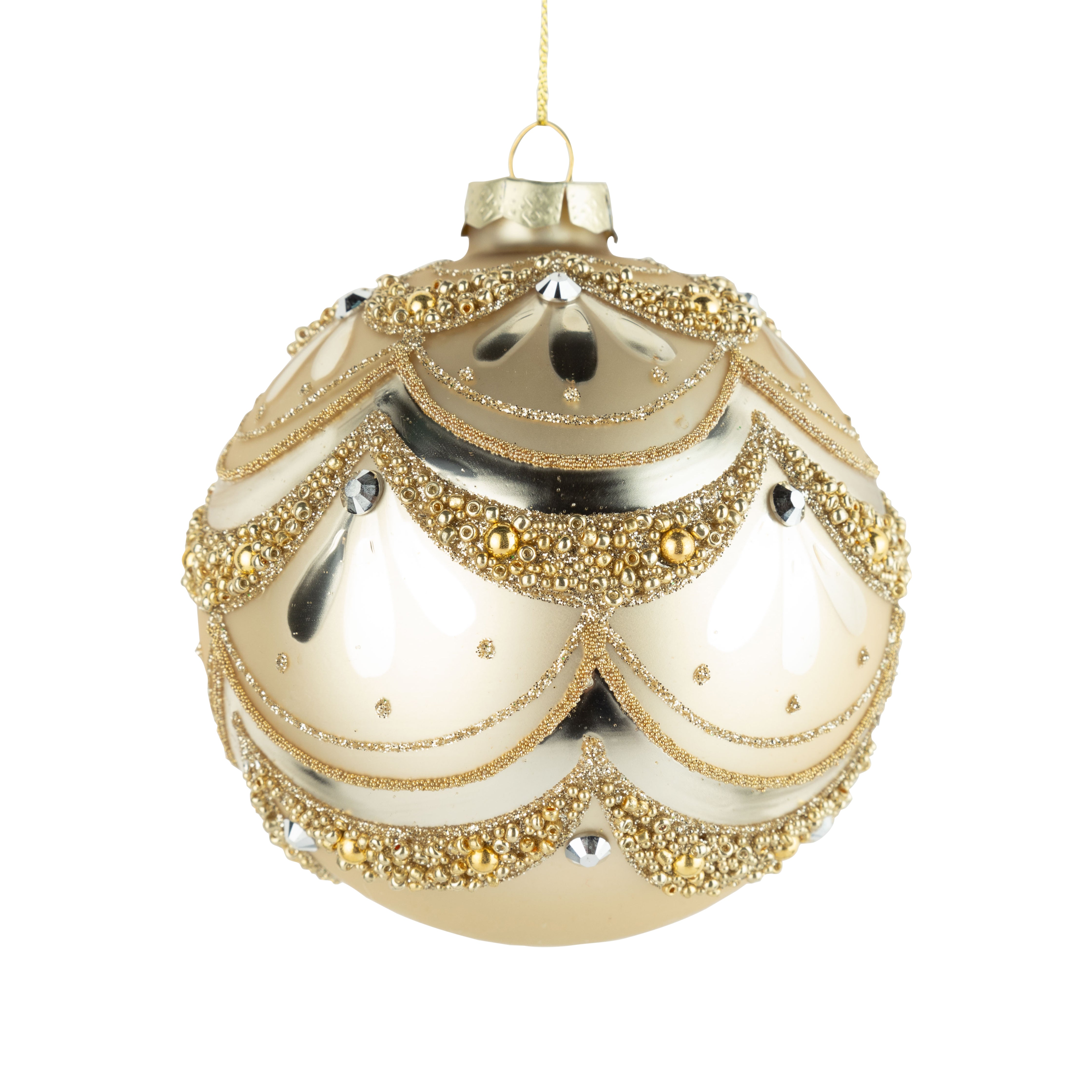 Glass ball ornament, matte pale gold with beaded swags, 4in