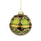 Glass trinket holder ball, shiny green with gold glitter swags, red jewels and gold metal hinge, 3in
