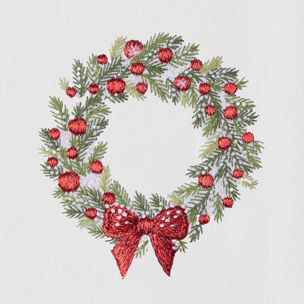 Celebrate the holidays with this cotton hand towel, featuring a hand-embroidered festive wreath. Delicate ornaments are stitched in metallic red thread. Soft, elegant, and perfect for adding a touch of seasonal charm to your kitchen decor. Hand embroidered towel on 100% cotton, finished and hemstitched by hand. * One Hand Towel. * 16 x 24 inches. *. CARE INSTRUCTIONS Hand wash or machine wash on gentle cycle, tumble dry on low heat until damp, line dry, iron on reverse for traditional finish.
