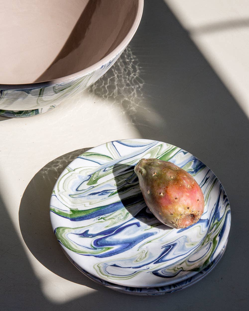 The ceramics are entirely handmade in a small atelier/factory located about 30 minutes outside of Marrakech. Each piece is crafted using a unique blend of black and white clays sourced from Spain, chosen for their strength, texture, and natural beauty. Because every item is shaped and finished by hand, no two pieces are exactly alike. Subtle variations in form, glaze, and finish are not imperfections — they are the signature of true artisan work and a reminder that each piece is one of a kind. The atelier is led by a Maâlem (master craftsman), who is also a ceramic teacher, passing down traditional skills while continuously refining his craft. Every piece reflects generations of knowledge, patience, and respect for handmade production. Product Overview * Color: Ocean: Blue/Green * Dimensions: 7.9" Fun and bold, the Marbled collection mixes inspiration from Moroccan pottery with the global tradition of marbling.