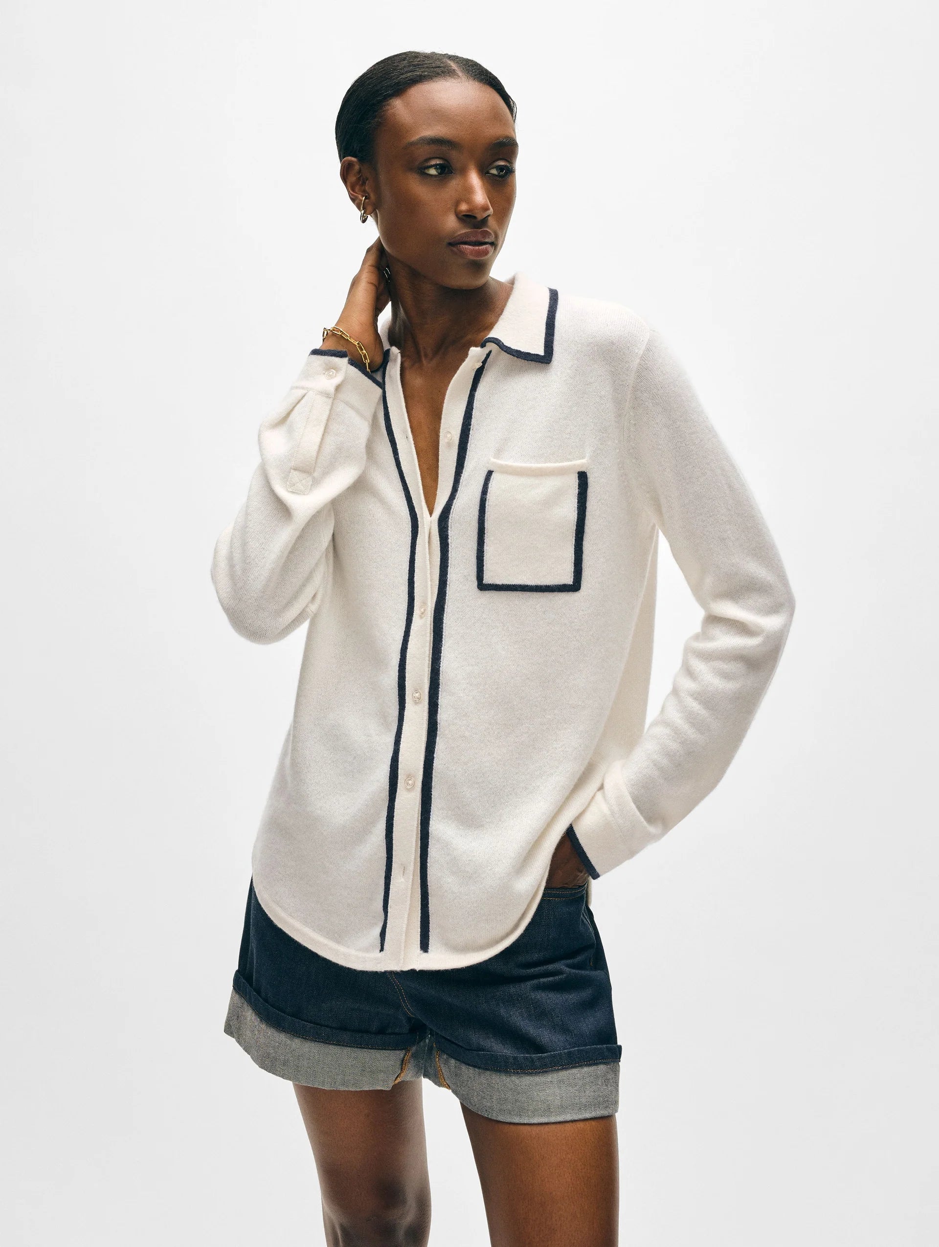 A tailored button-down shirt knit from 100% cashmere with a menswear-inspired appeal. Designed with contrast tipping along the collar, placket, and pocket for a clean, modern edge.