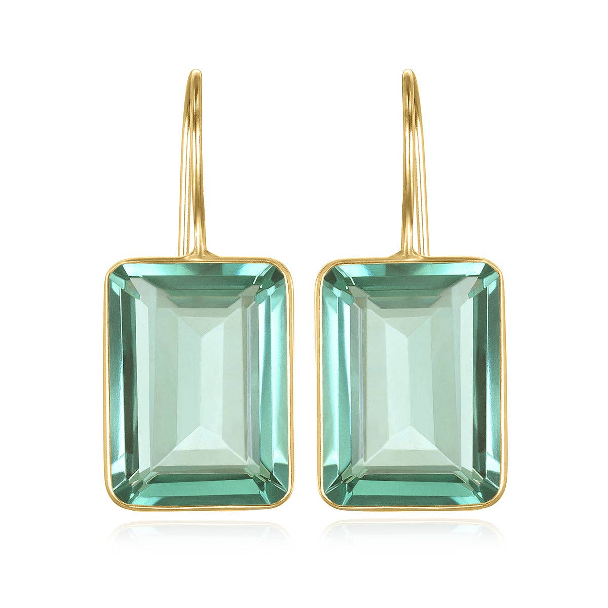 Eye-catching sage green quartz is bezel set on French hook ear wires. 14k gold plated, 1.25" total drop and 5/8" in width.