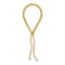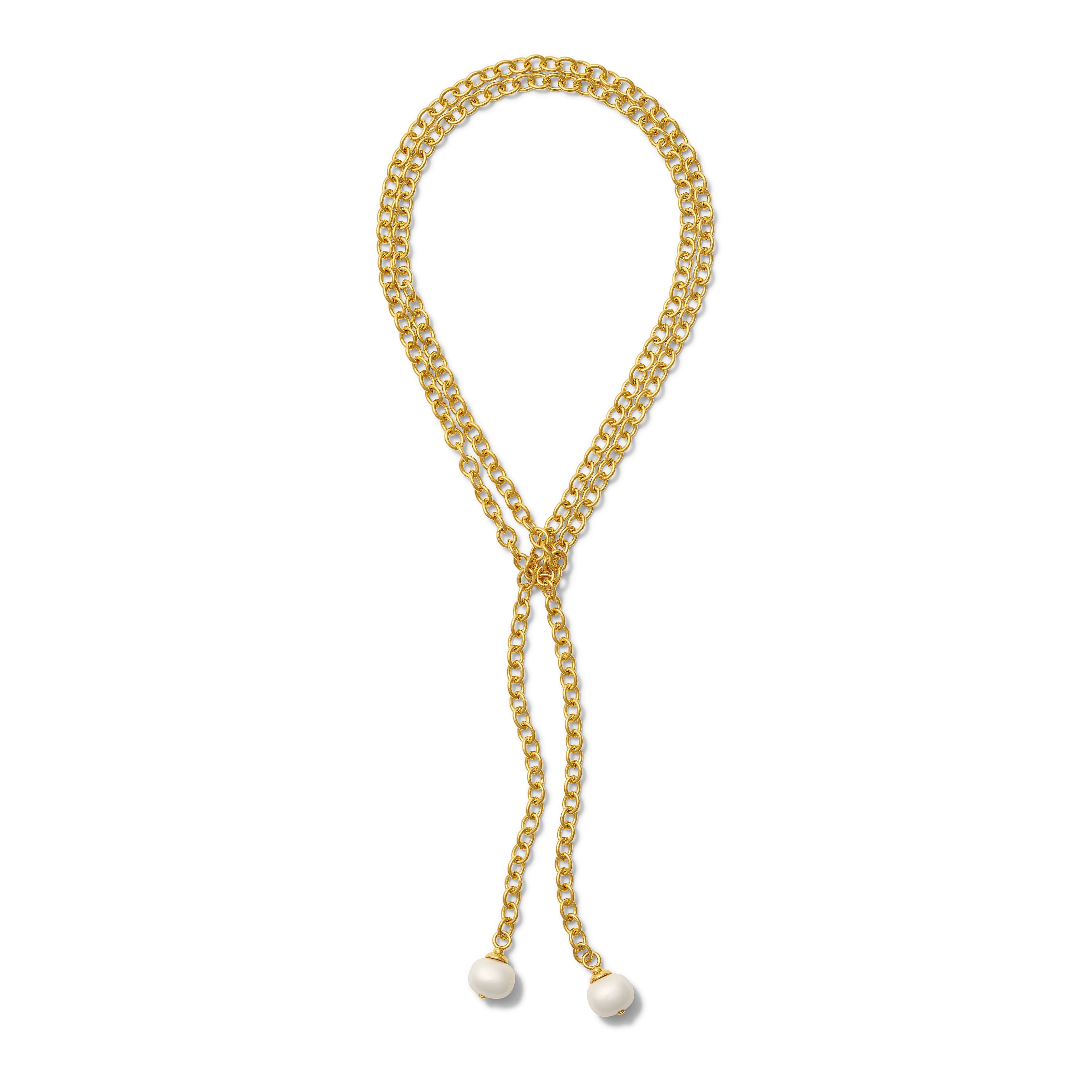 Two pearls. Endless possibilities. Wrap it your way. The Details long cable link chain lariat to wrap a multitude of ways 50"  polished 14 karat gold over brass finish medium pebble pearls in creamy, classic white measure 13 x 16mm